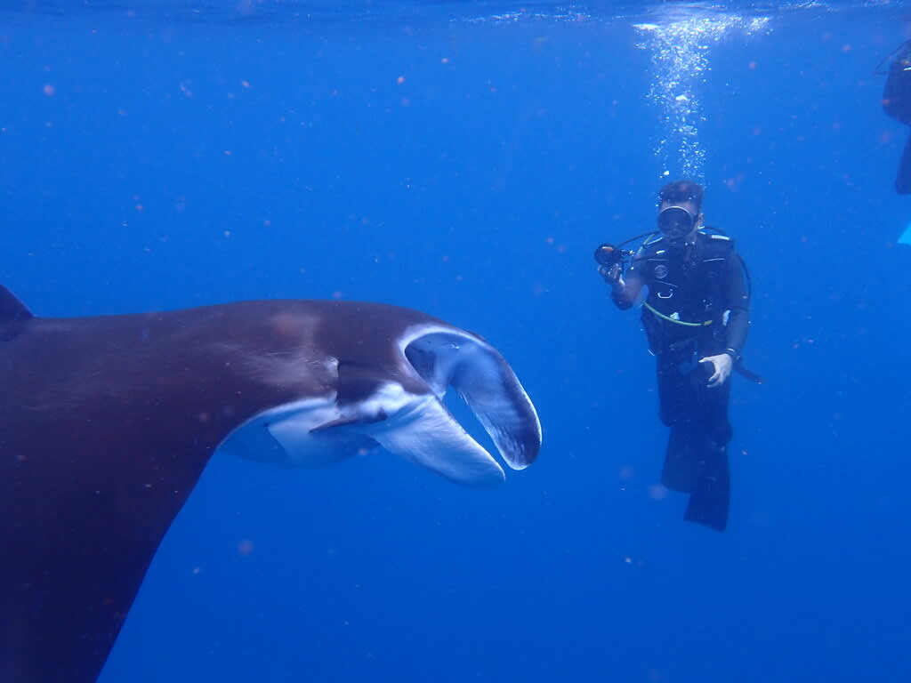 水面近くでは、大きな口を大きく開けて、海水を吸い込んでいるマンタが超接近!!