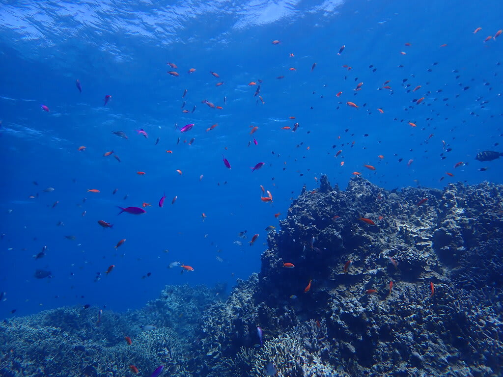 素通りマンタ、クサハゼ、ミドリリュウグウウミウシ、ハナヒゲウツボ幼魚、ハダカハオコゼ(ピンク・白)、シライトウミウシ、アカククリ、ノコギリダイ、ヒトスジギンポ、アオウミガメ、etc…