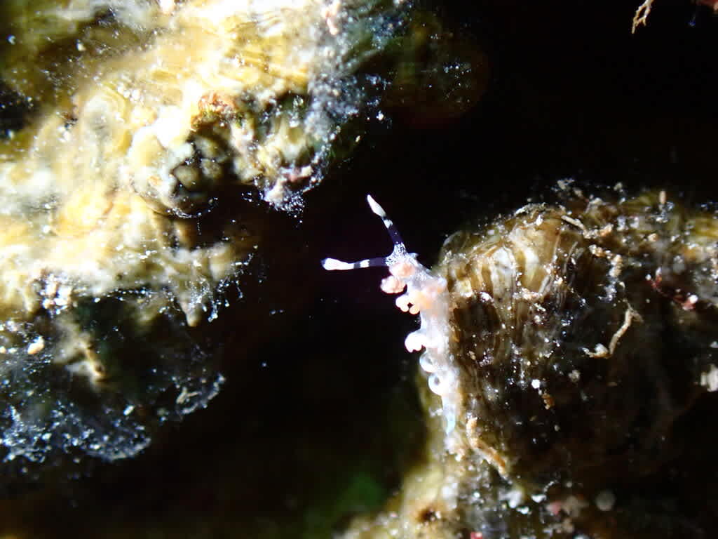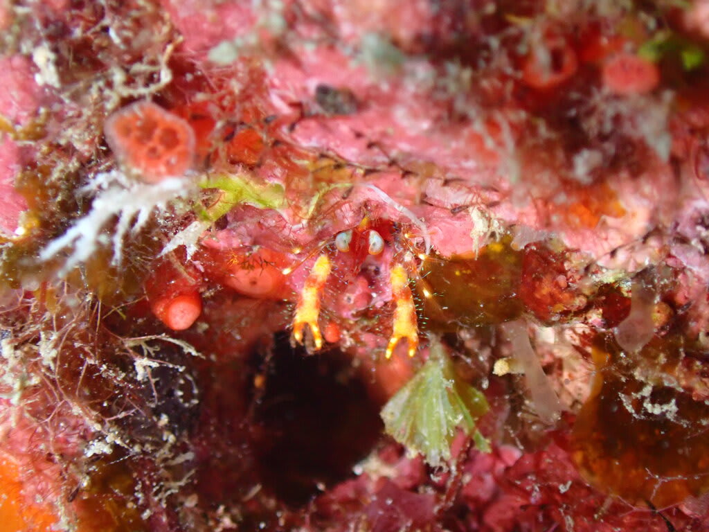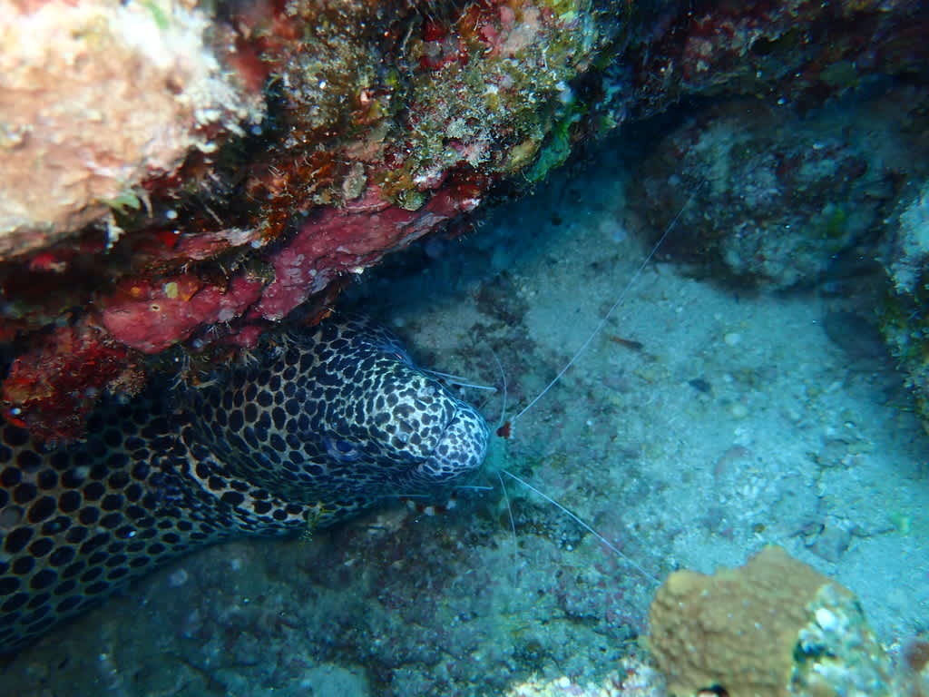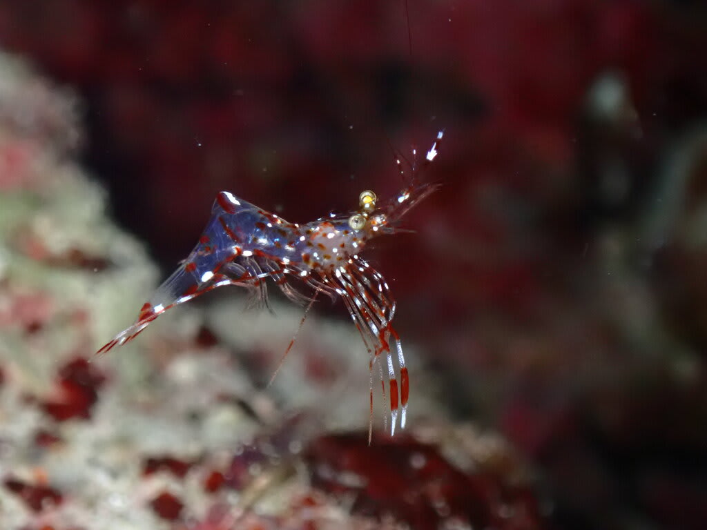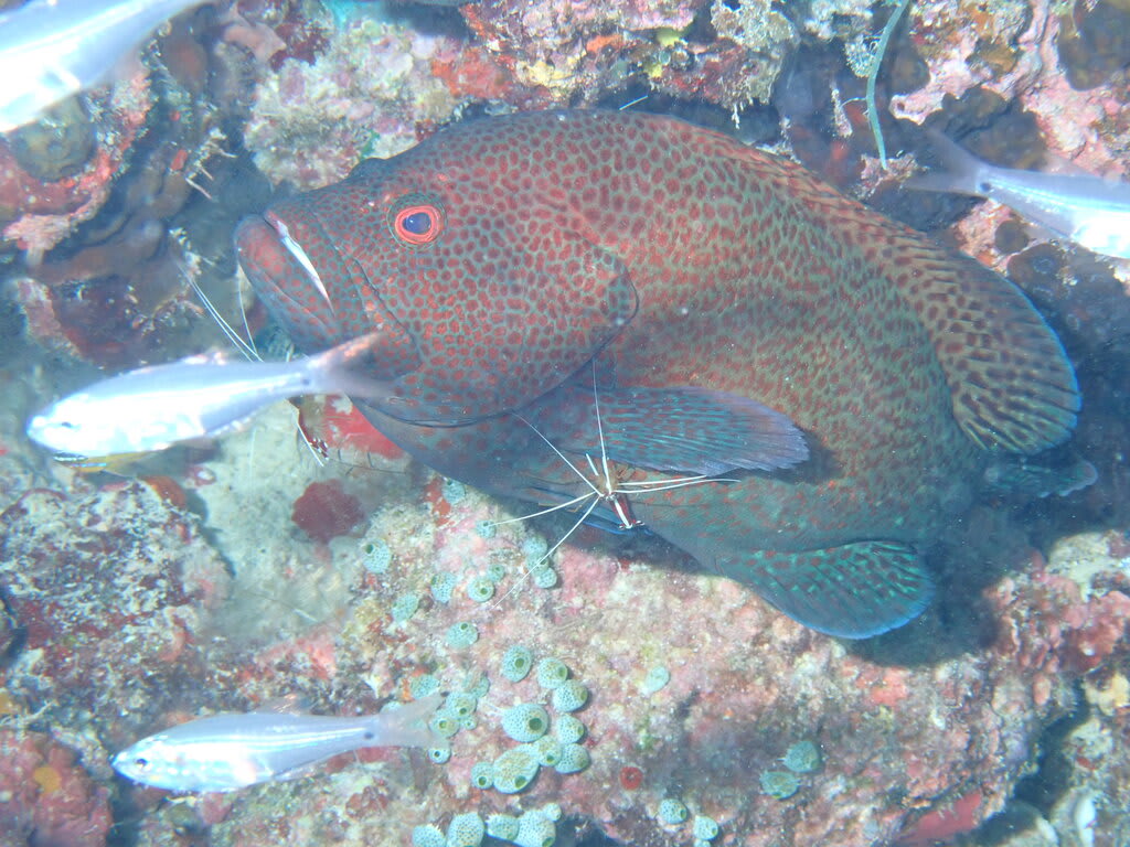 アカシマシラヒゲエビがせかせかとアザハタをクリーニング