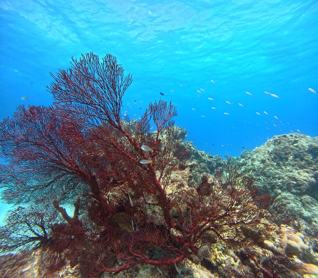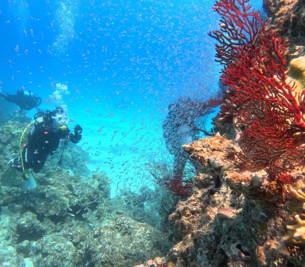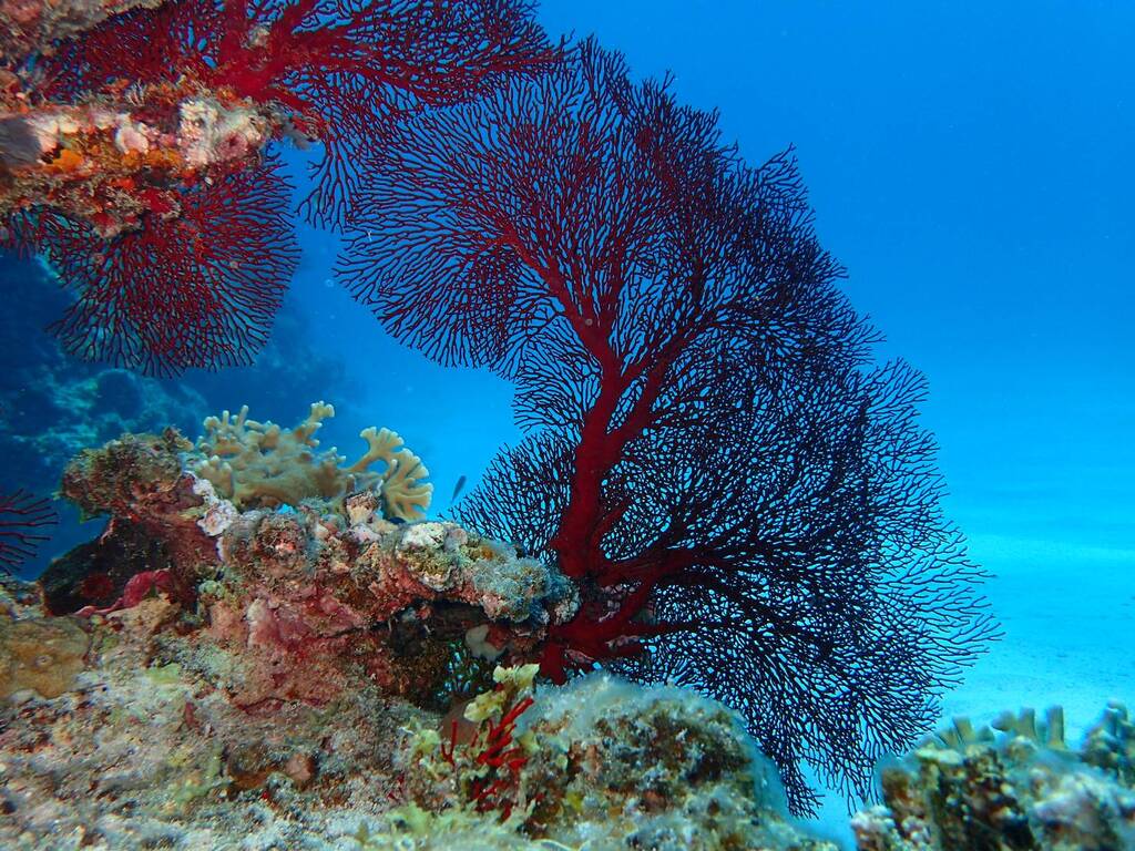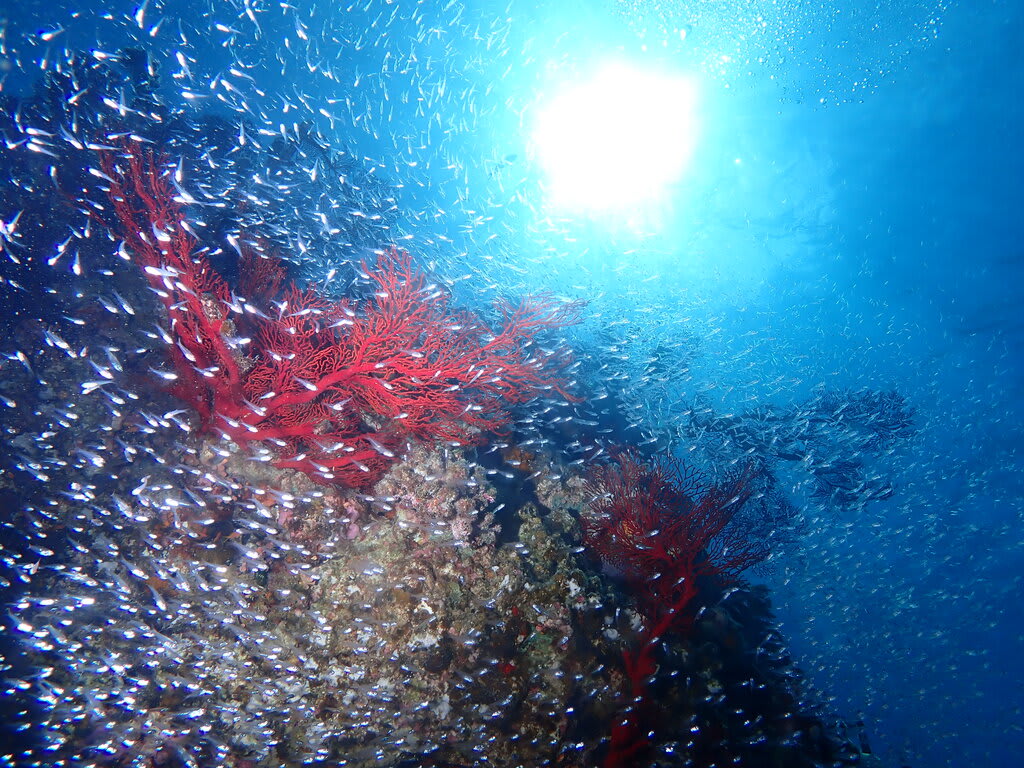 透明度の高い海に、白い砂地、真っ赤なイソバナ、カラフルな生き物