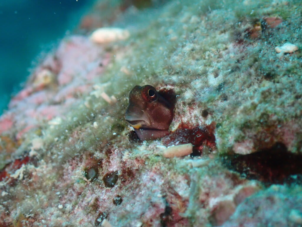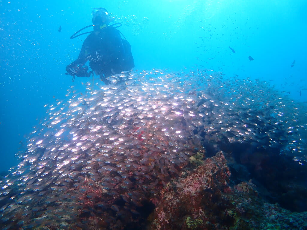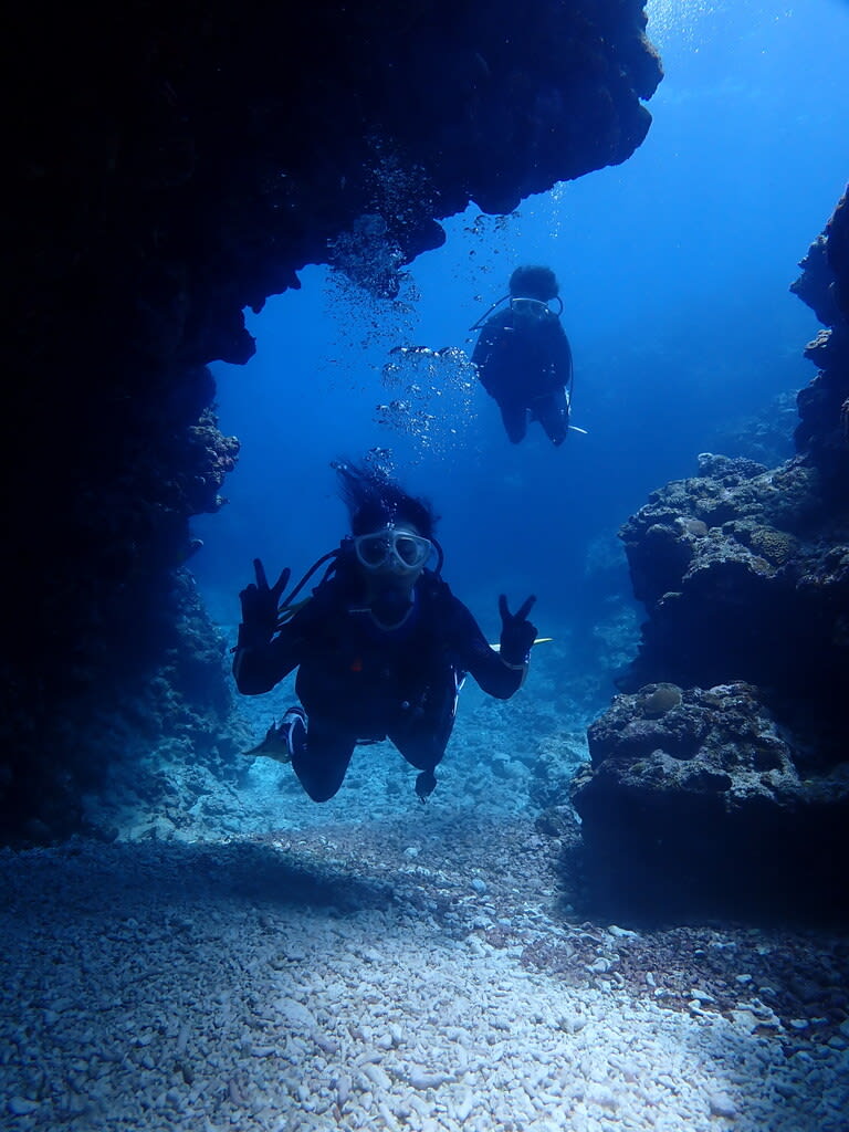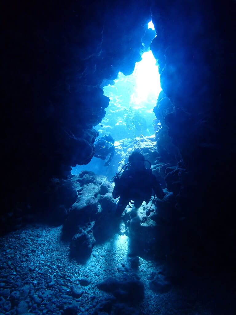 初めての洞窟。水中での暗闇はちょっぴりドキドキ感もあり