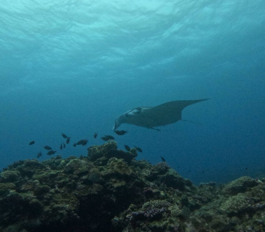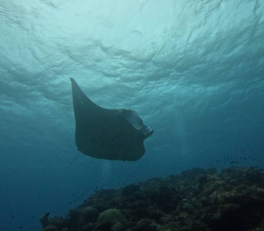 水面だと、せわしく動き回るマンタを追いかけるのが大変。