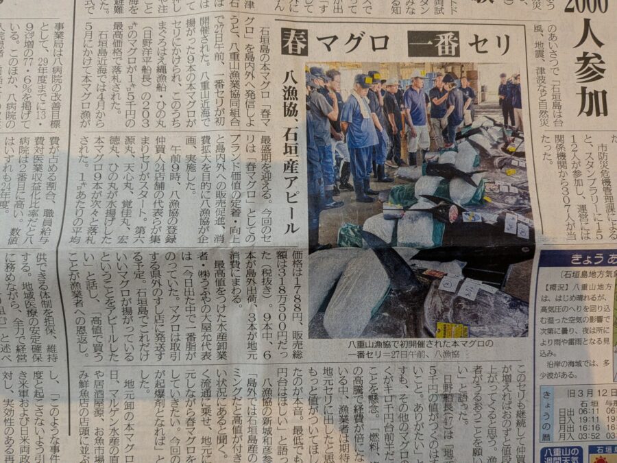 ハイサイ、穏やかで良い天気の石垣島です😊今朝の新聞で石垣島でも本マグロ春マグロ一番セリが開催されたそうです‼️石垣島の居酒屋でも安く提供されるといいな〜😆