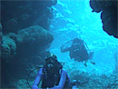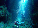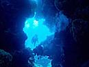 地形派ダイバーには、たまらないポイント。迷路のようになったクレバスの間をくねくね進んでいくと、ぽっかりと大きな口を開けた洞窟の入り口へ。暗闇のホール内に天井の隙間から光のシャワーが降り注ぎ、神々しいばかり。浅瀬にはスーパー珊瑚が広がっている。